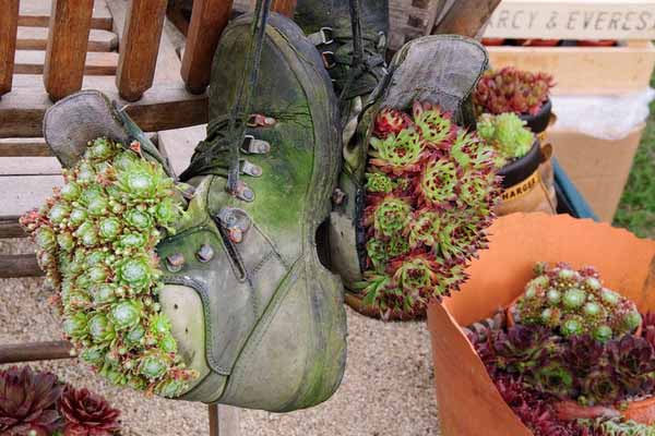 You can use small planters for growing plants and flowers ad keep them in shoes or boots. It is a convenient way to fences, doors and walls are decorated with hanging planters made of old shoes or boots.