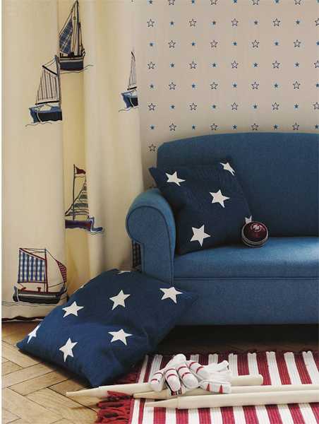 Cots and dressers with colorful tall ships, air craft and locomotives great for boys bedrooms. Window curtains and children's furniture upholstered in soft quality, gorgeous views of tall ships, patriotic decoration pattern as blue and red stars, inspired by the American flag, you create bright rooms decorated in boys bedrooms.